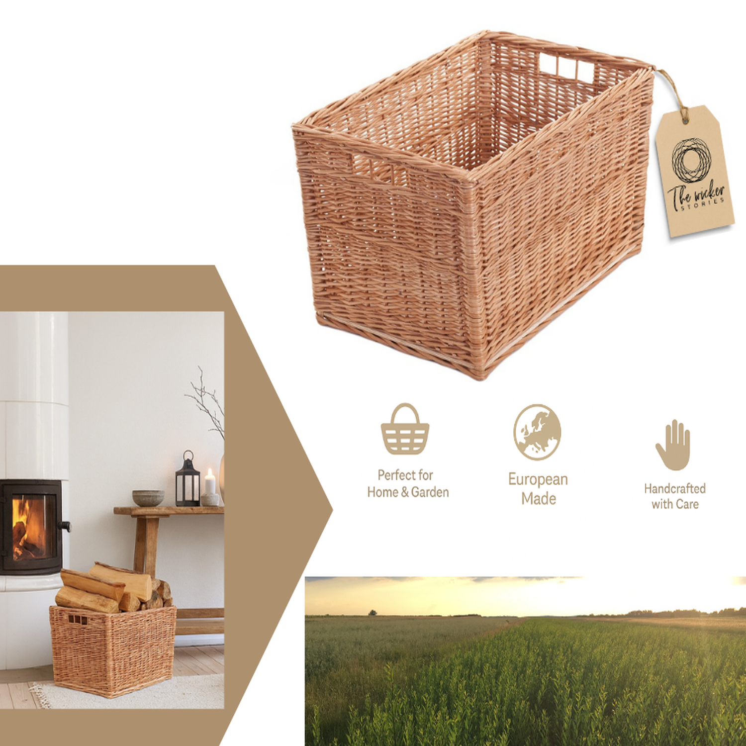 Wyrób powstaje z ekologicznej wikliny pochodzącej z europejskich upraw i jest w pełni ręcznie pleciony. Taki sposób wykonania przekłada się na trwałość i odporność na codzienne obciążenia. Wiklina jest lekka, odnawialna i przewiewna, dzięki czemu kosz dobrze „oddycha” i ułatwia naturalne dosychanie drewna.