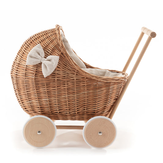 Ten wiklinowy wózek dla lalek zachwyca ciepłym odcieniem i równym splotem tworzącym klasyczną gondolę z podniesioną budką. Wnętrze wyłożono miękkim, beżowym lnem z kokardą; komplet uzupełniają poduszka i kołderka. Gładka drewniana rączka i cztery kółka z białymi, gumowanymi obręczami dopełniają całości.