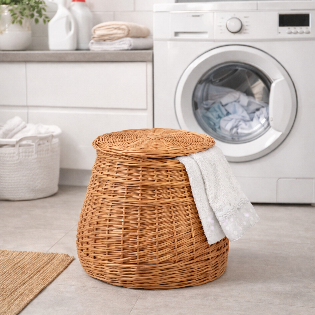 Ten kompaktowy, wiklinowy kosz na pranie ma naturalny, miodowy odcień i gładko wykończone krawędzie. Delikatnie rozszerza się ku dołowi, co nadaje mu miękki, domowy charakter. Gęsty splot i wzmocniona obręcz zapewniają stabilność, a dopasowana pokrywa pewnie zasłania zawartość.