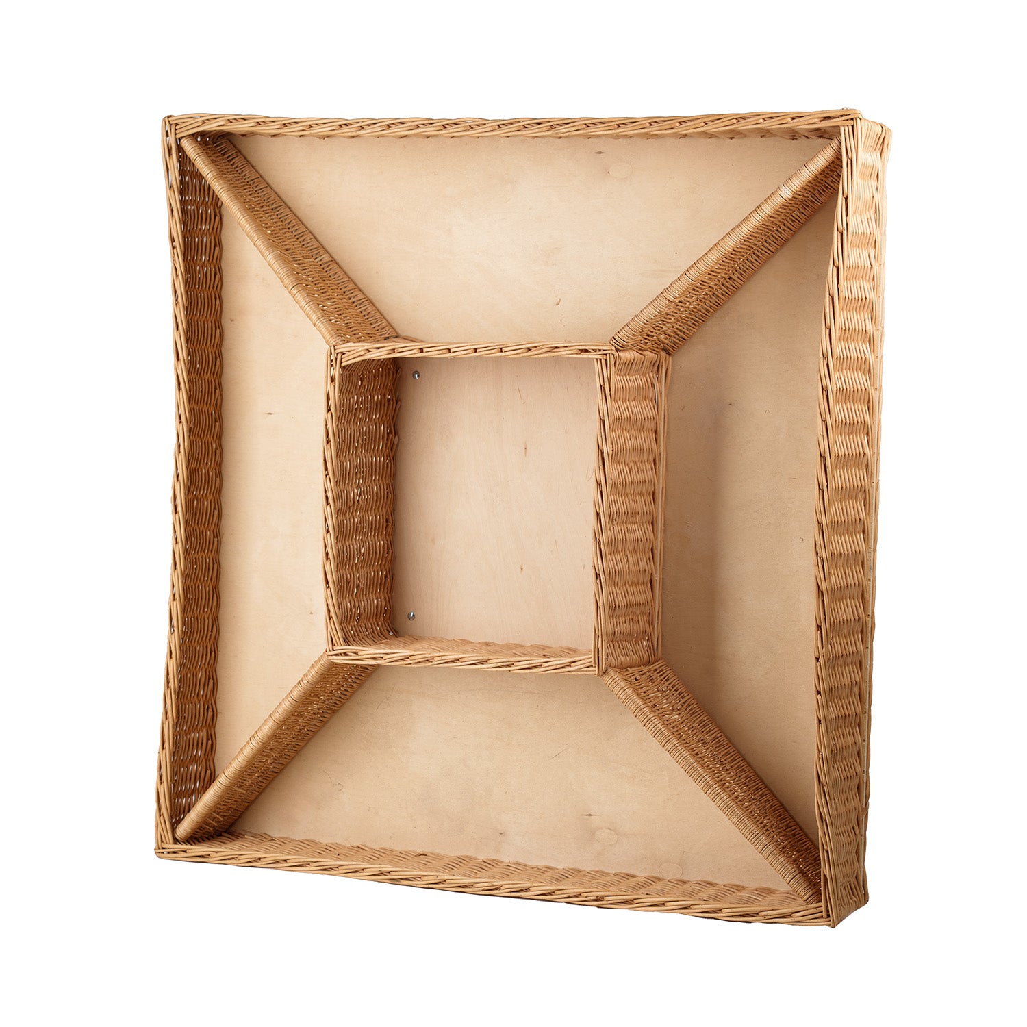 Ta duża wyspa owocowo-warzywna z naturalnej wikliny wyróżnia się równym splotem i starannym wykończeniem. Dno osadzono na jasnej sklejce, która zwiększa stabilność i chroni spód. Powierzchnia jest gładka, bez odstających końcówek. Kosz ma duże wymiary: 120x120 H:22 (cm).