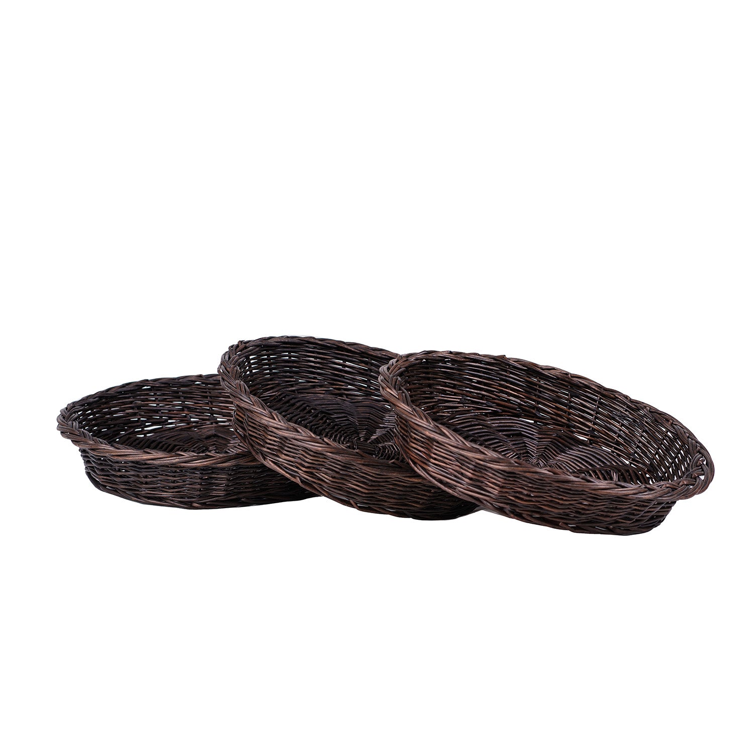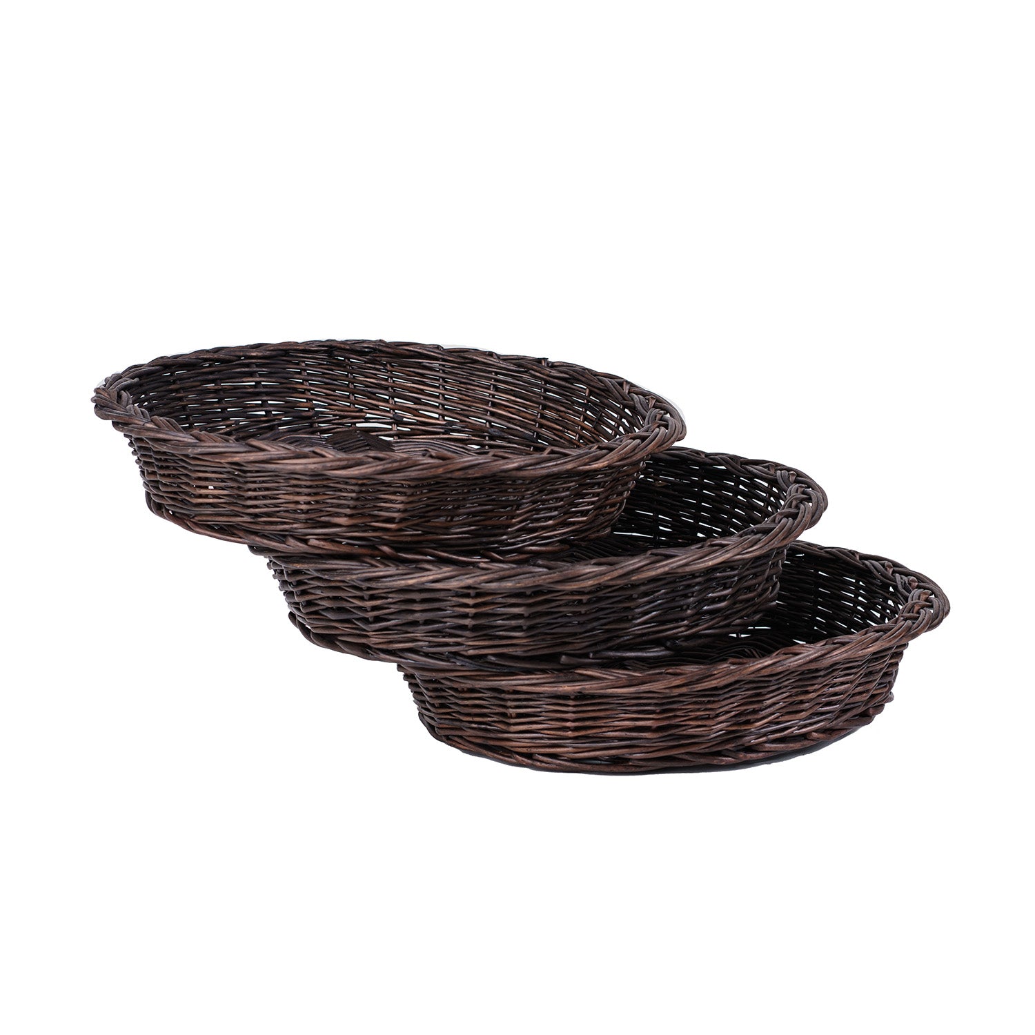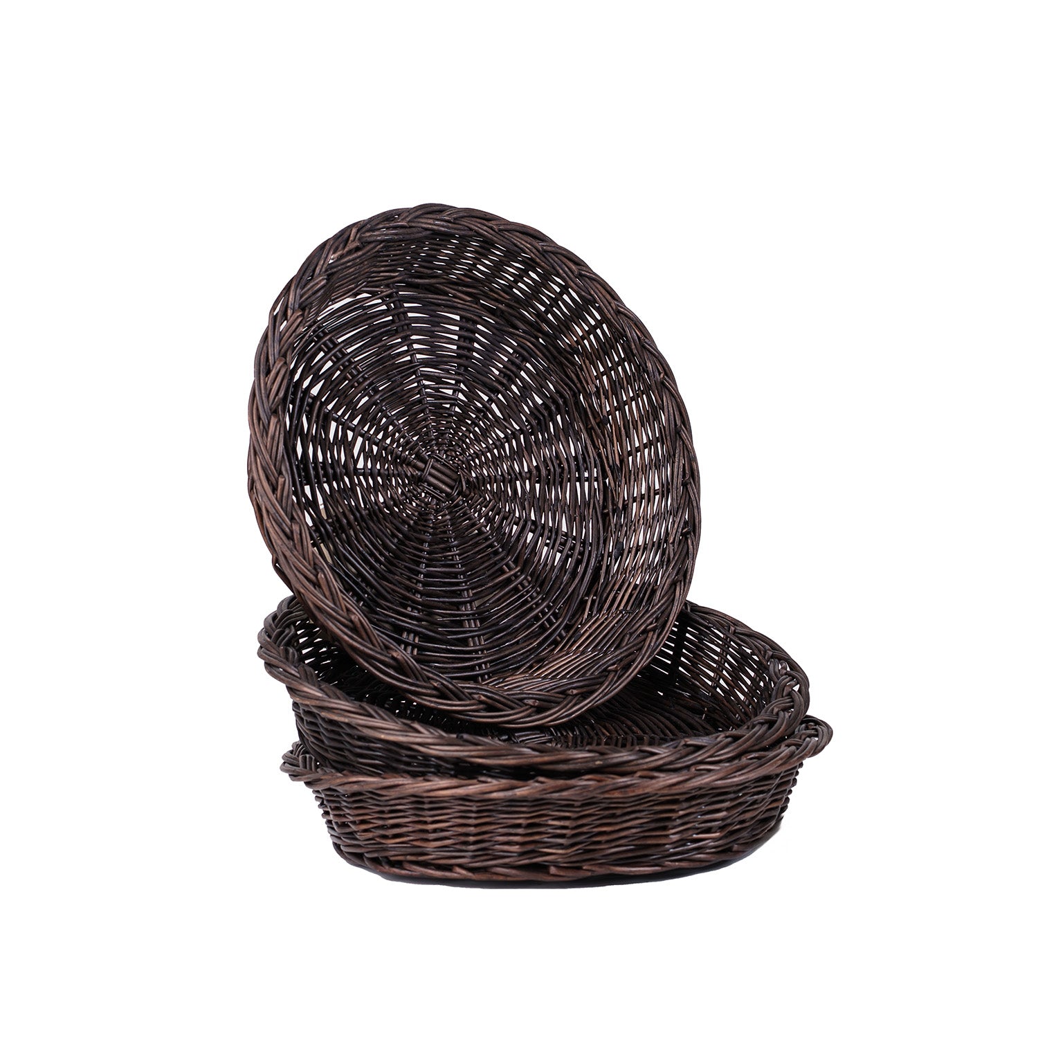 Zestaw trzech okrągłych koszyków wiklinowych w kolorze ciemnego brązu powstał z myślą o estetycznym serwowaniu pieczywa. Mają niskie ścianki, otwartą formę i płaski, stabilny spód, dzięki czemu wygodnie sięga się po bułki i rogaliki. Równy, staranny splot prezentuje się schludnie na ladzie i stole bufetowym. Zaokrąglony rant jest przyjemny w dotyku i wygląda elegancko.