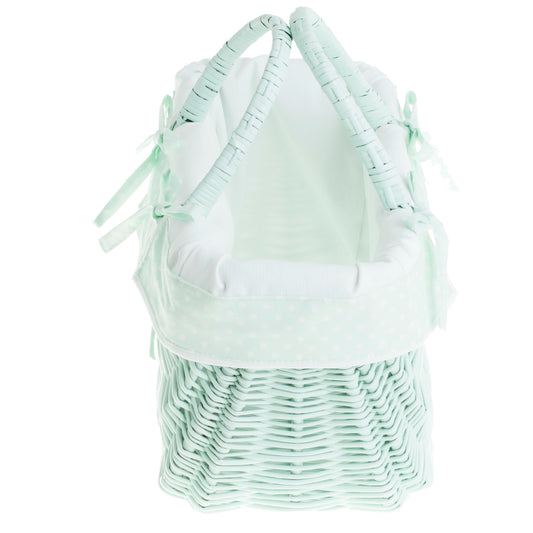 Ten wiklinowy kosz z obszyciem, utrzymany w kolorze miętowym, ma formę torby z gęstym, falistym splotem oraz podwójnymi, łukowatymi uchwytami. Rant jest starannie wywinięty, a ścianki płynnie przechodzą w stabilne dno. Całość uzupełniają dekoracyjne, wiązane kokardki z przodu, które nadają koszowi subtelnego, kobiecego charakteru. Lekka, a zarazem solidna konstrukcja pewnie chroni zawartość.