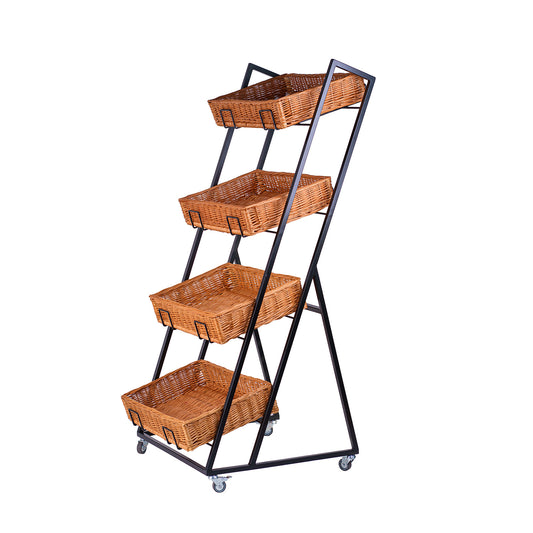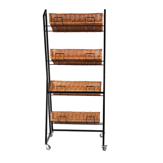 Prostokątny mobilny duży stojak metalowy z 4 koszykami wiklinowymi to praktyczne i estetyczne rozwiązanie do ekspozycji produktów w przestrzeniach handlowych. Stabilna konstrukcja metalowa została połączona z czterema ręcznie plecionymi koszykami z naturalnej wikliny, tworząc spójną i trwałą całość. Prostokątna forma oraz ekspozycja ustawiona pod kątem zapewniają czytelność i atrakcyjną prezentację asortymentu.