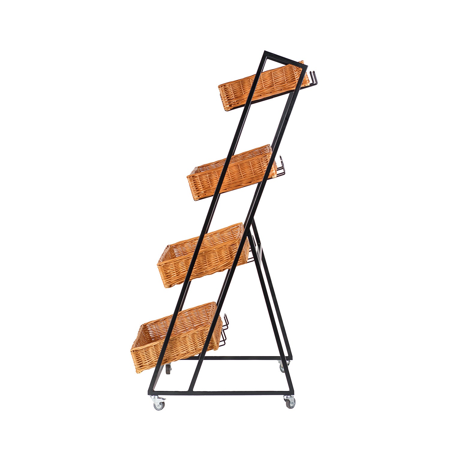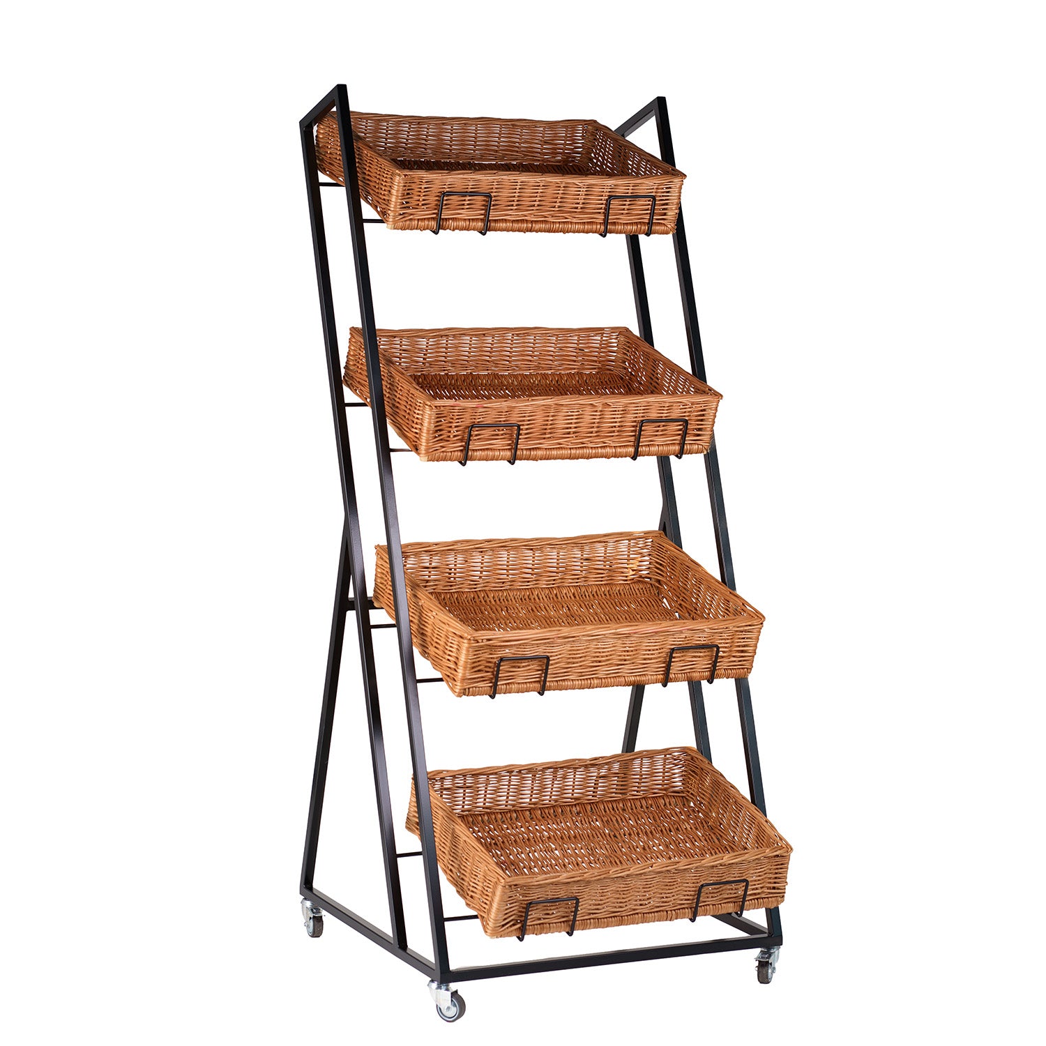 Wybierz mobilny stojak metalowy z koszykami wiklinowymi, aby stworzyć trwałą, funkcjonalną i atrakcyjną ekspozycję produktów w standardzie handlowym i HORECA.