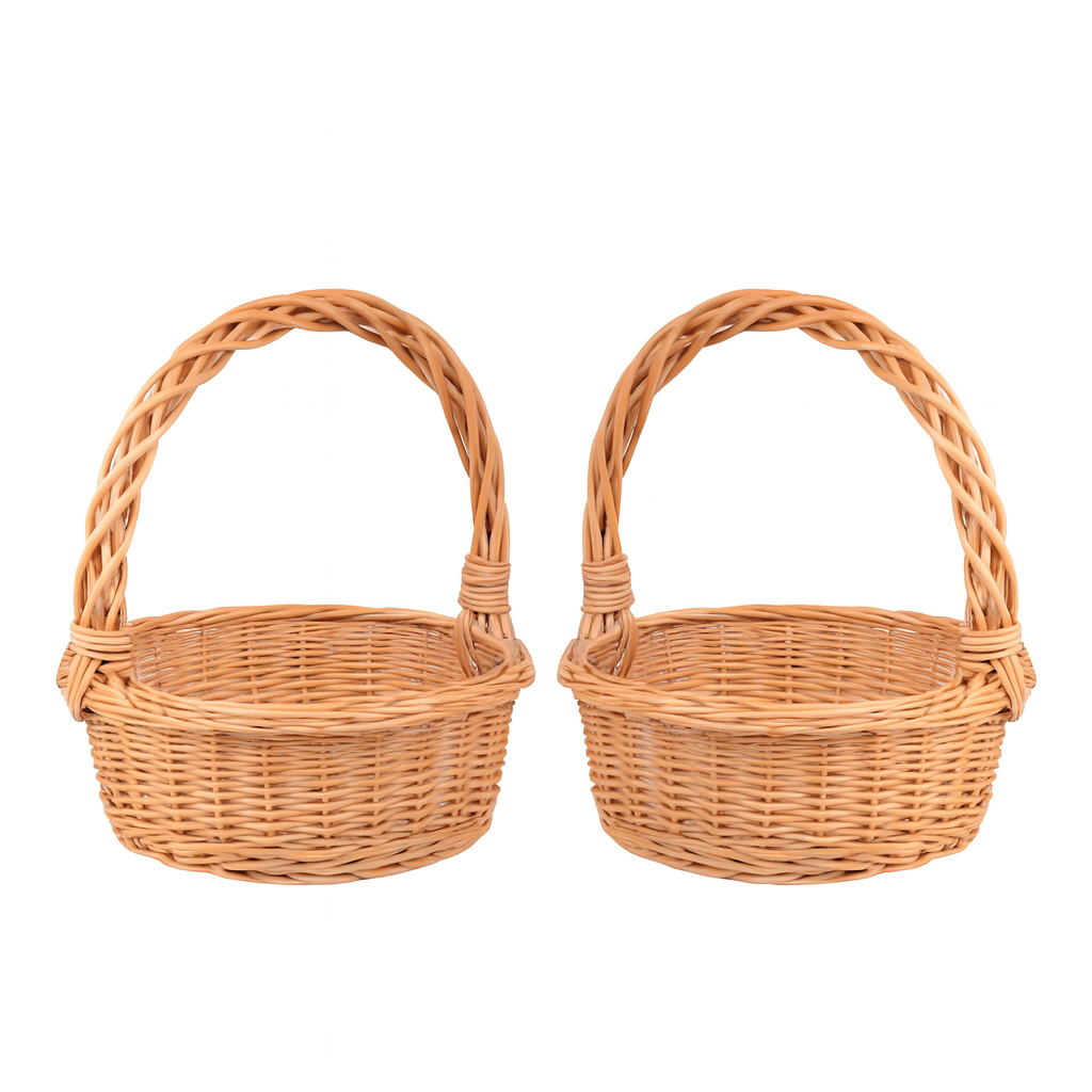 Zestaw obejmuje dwa małe, okrągłe kosze wiklinowe z ozdobnym pałąkiem o kompaktowych wymiarach Ø30 H:11/31 (cm). Niewielki rozmiar sprawia, że kosze idealnie nadają się na kosze prezentowe, dekoracje sezonowe oraz ekspozycję produktów na ladzie sklepowej, gdzie liczy się estetyka i oszczędność miejsca.