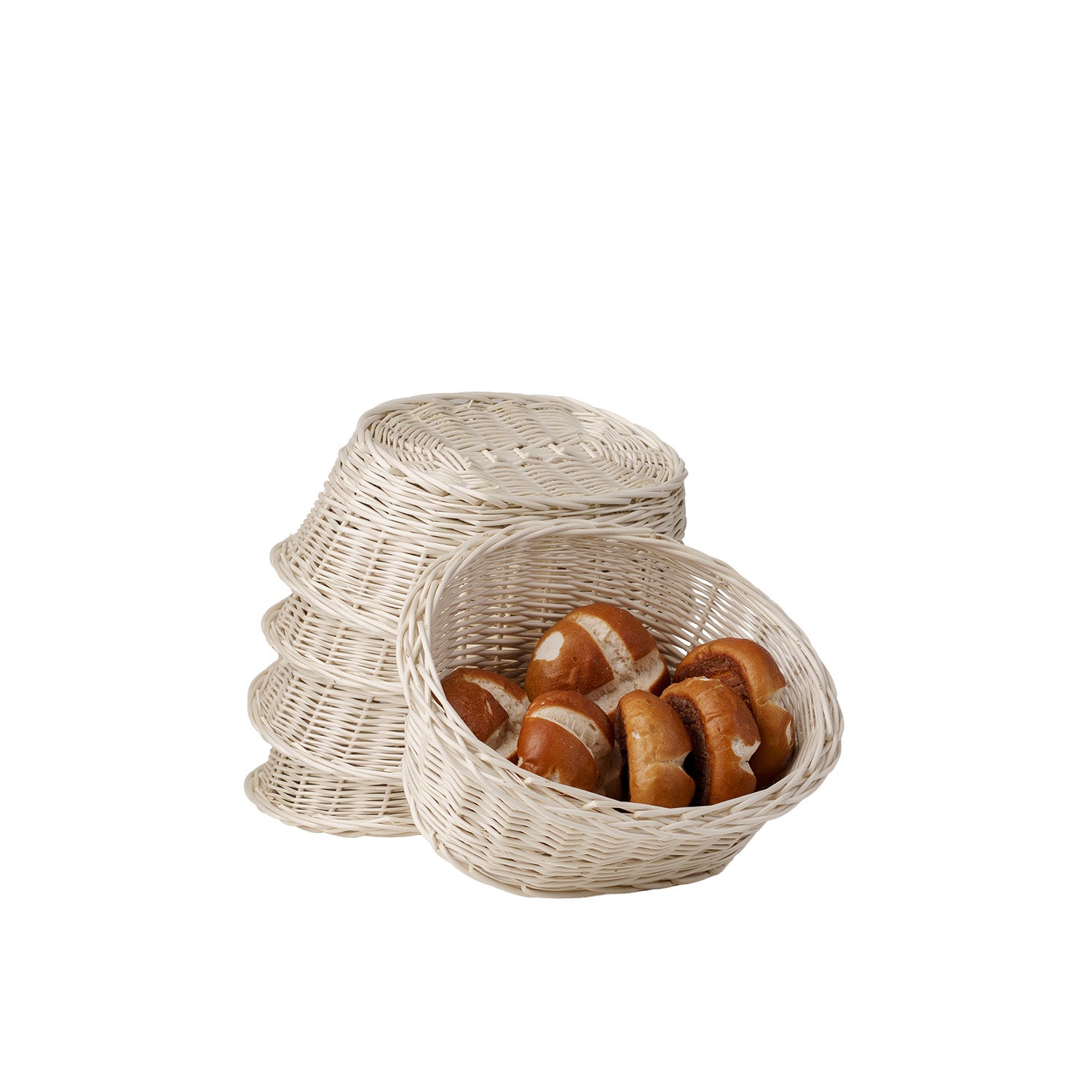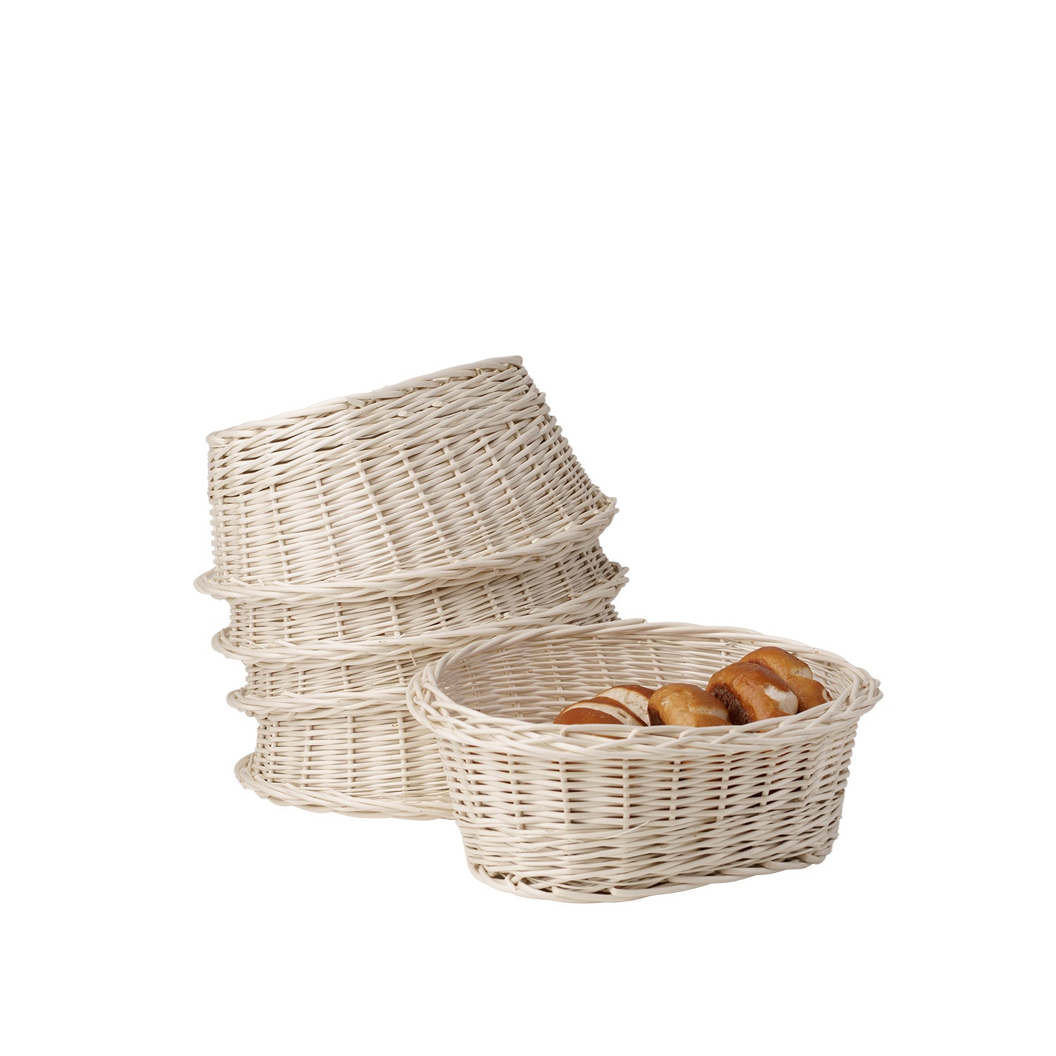 Wybierz zestaw 5 wiklinowych koszy w białym kolorze i stwórz estetyczną, funkcjonalną ekspozycję pieczywa w swojej piekarni lub bufecie – zamów teraz.