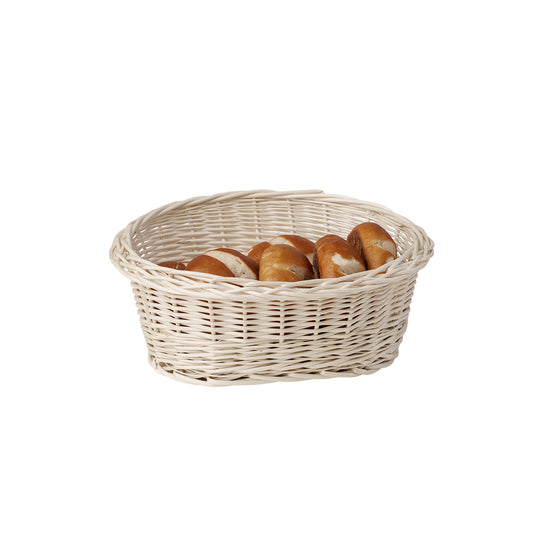Wykonane ręcznie z naturalnej, wybielanej wikliny, kosze łączą trwałość z ekologią. Rzemieślnicza praca gwarantuje powtarzalną jakość i solidną konstrukcję, która sprawdzi się przy intensywnej eksploatacji w branży HoReCa. Wiklina jest lekka, a jednocześnie wytrzymała – kosze zachowują swój kształt, mają stabilne krawędzie i równe dno, co ułatwia ustawianie ich na ladzie, półkach oraz w regałach.