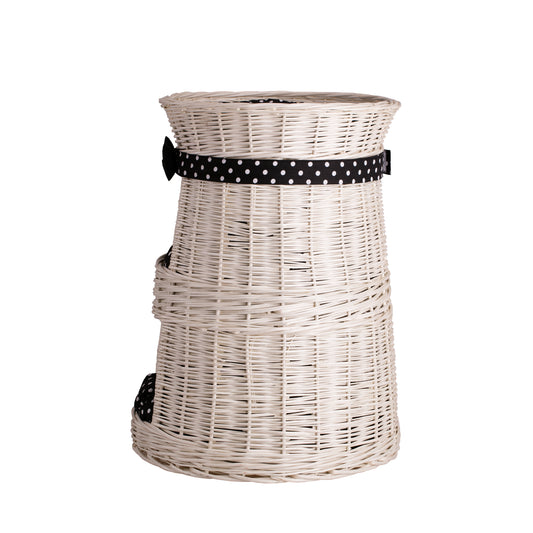 An elegant, round cat house made from natural wicker in a creamy shade delights with its neat, dense weave and softly rounded edges. Three levels create two cozy beds plus an open top that serves as a terrace. Entrances are comfortable and the interiors are filled with soft black cushions. The top is trimmed with a black ribbon and bow. This wicker cat basket will be an attractive addition to any interior (SEO keywords: wicker cat house, wicker cat bed, 3-tier cat house).