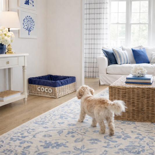 Elegant rectangular wicker basket-style pet bed combines natural charm with homely warmth. The whitewashed basket features a neat, attractive weave and carefully finished edges. The interior is lined with a soft navy cover and includes a matching cushion. The cushion is soft and the interior spacious. On the side of the bed are letters with your pet's name.