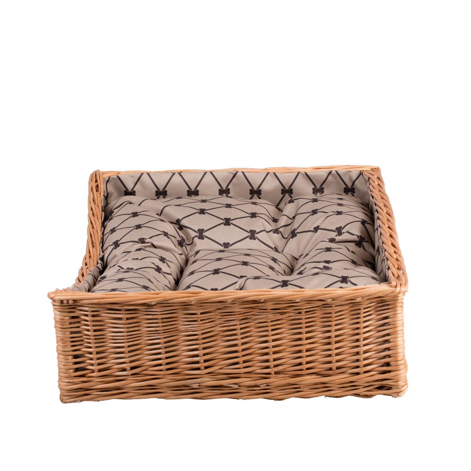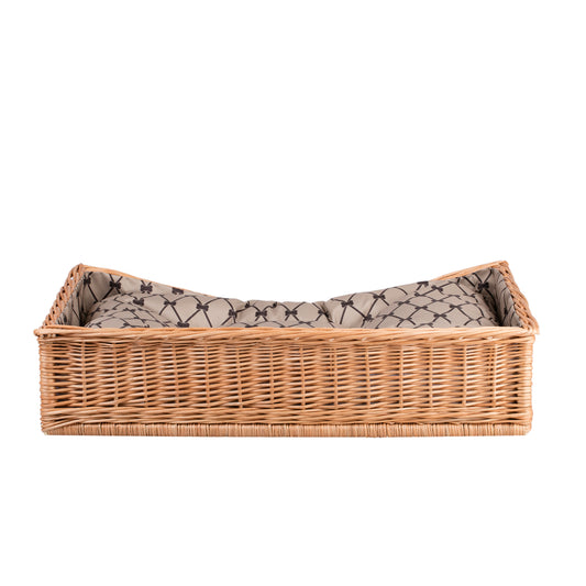 The rectangular bed-basket made from full wicker features a subtle, timeless look and a carefully even weave. The front is slightly lowered to ease entry, and all edges are smoothly and safely finished. The interior is dressed with a soft beige trim that matches the included cushion. The neutral colorway fits any interior.