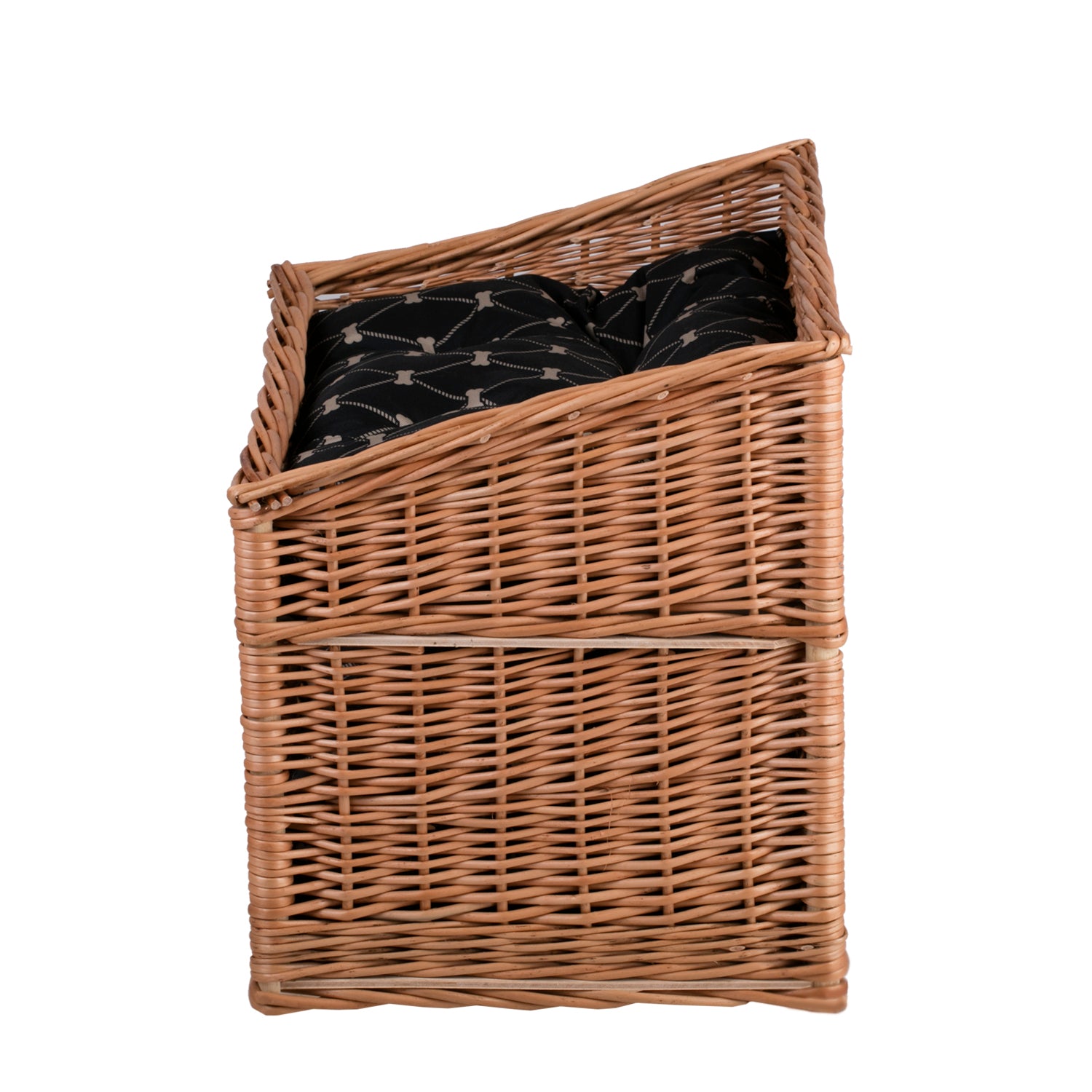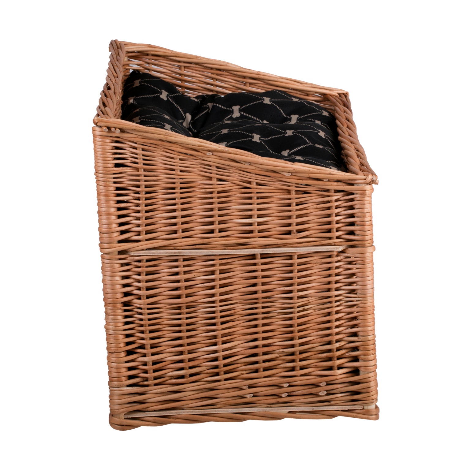 The rectangular cat house from e-wicker24 delights with its clean shape and even weave. The body of natural wicker forms two levels: a cozy “cave” below and a comfortable terrace above. The front features a wide entrance and a stylish window with vertical slats that let in light and air. Soft black cushions with a subtle pattern lie on both levels.
