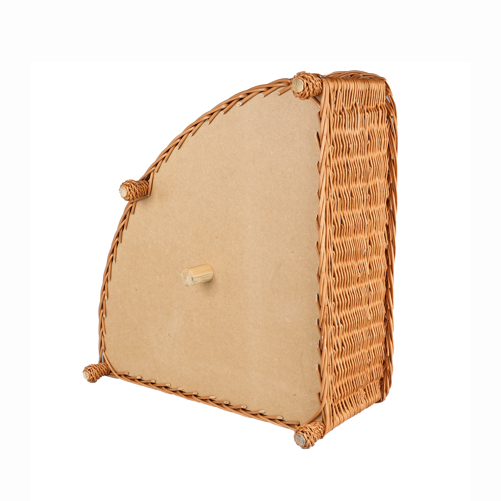 An elegant corner wicker pet bed that looks light and natural. The weave is even and dense, and the rounded front creates a soft line. Higher side walls form a cozy retreat. The natural wicker tone complements the soft cushion tailored to the basket's interior. The whole piece stands on low legs that lift the bed off the floor. Edges are carefully finished, pleasant to the touch and safe for paws.