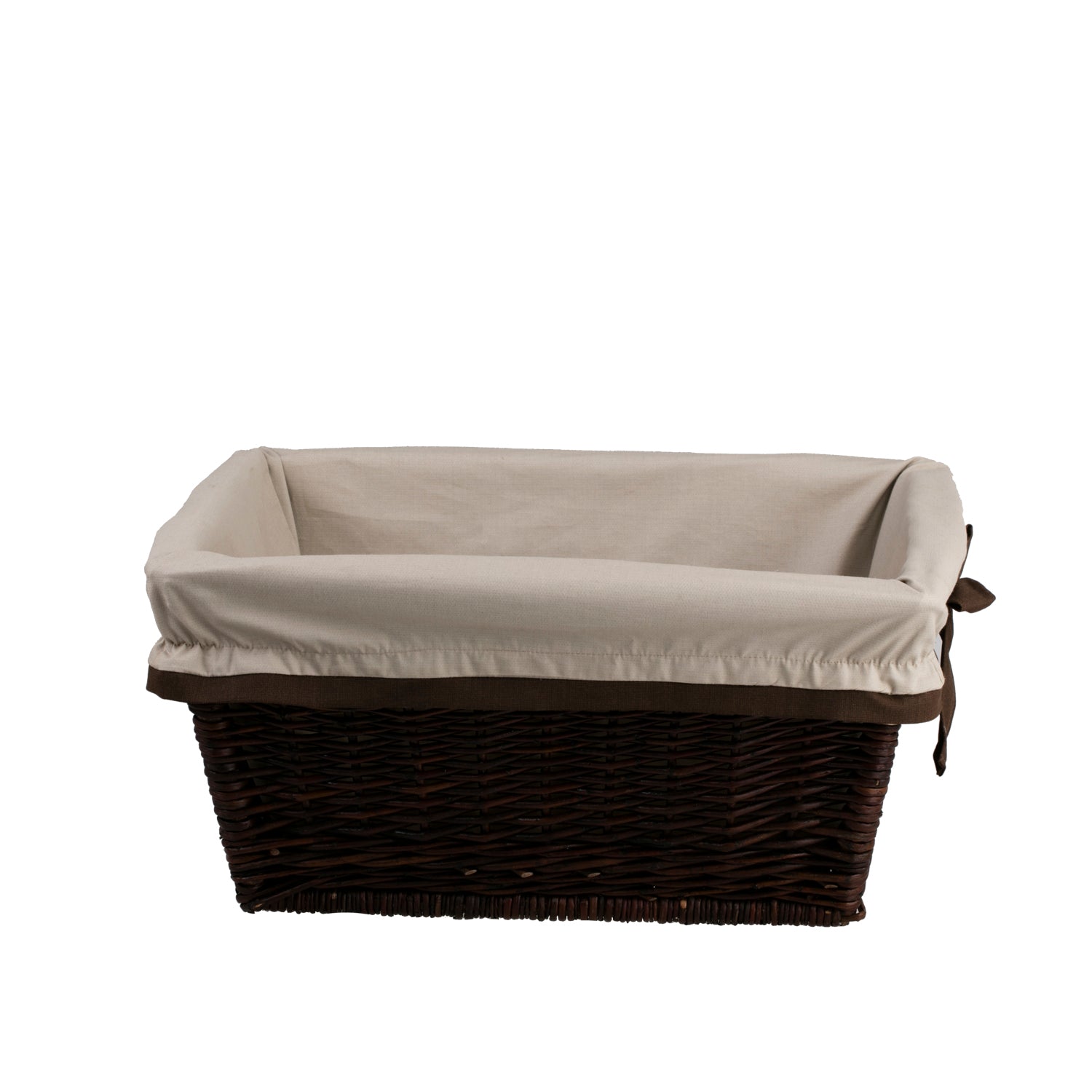A rectangular wicker basket in a noble dark-brown shade impresses with a careful, dense weave and a minimalist silhouette. A solidly woven rim increases rigidity, and integrated handles make it easy to carry. The interior is lined with a cream fabric with dark piping and elegant ties. The edges are neatly finished and the weave has a subtle natural sheen.