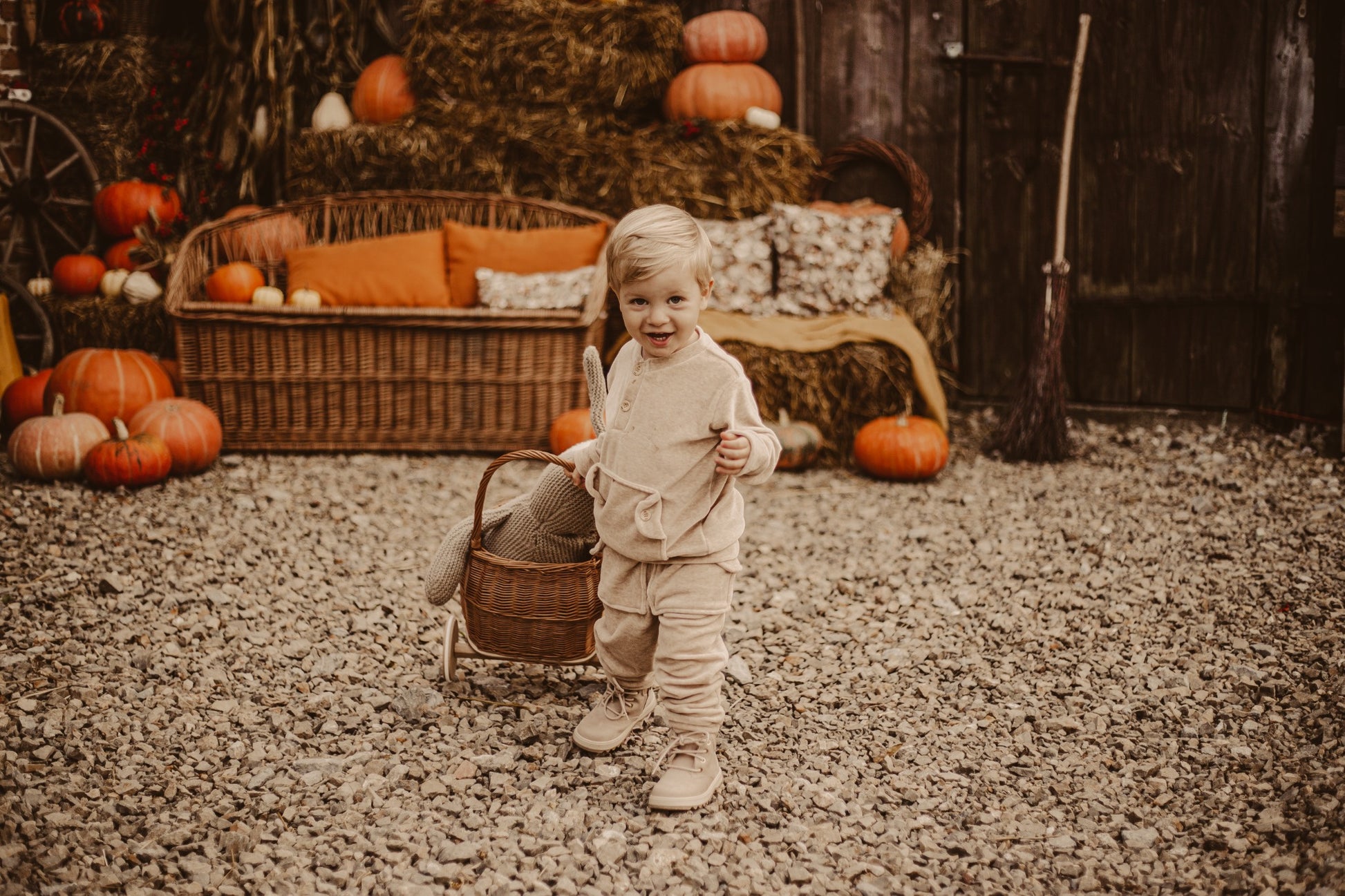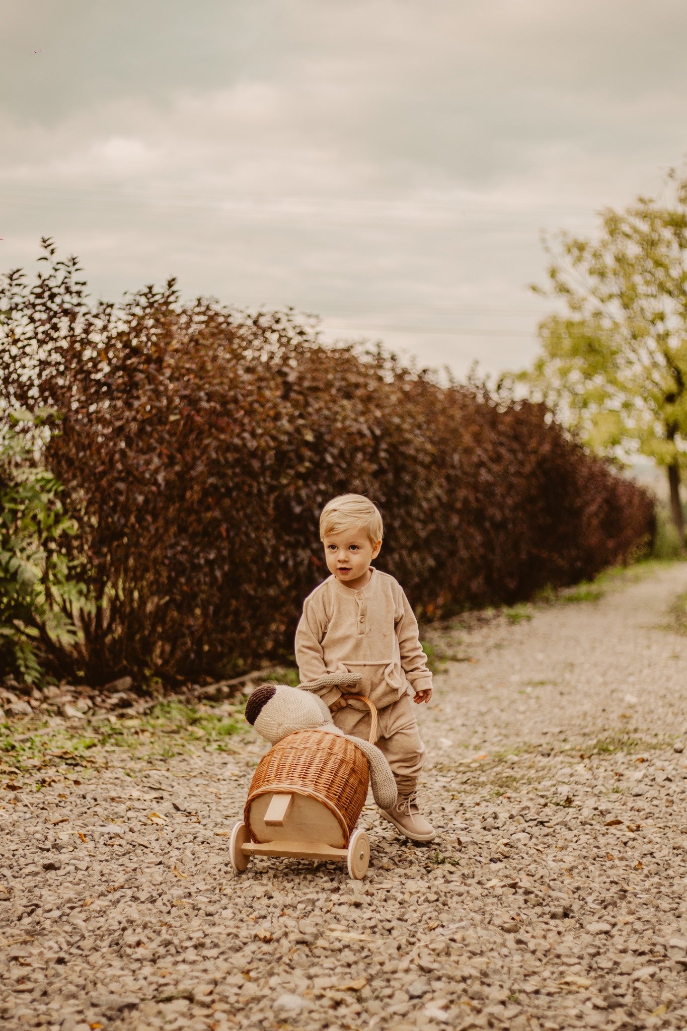 A wicker push walker for children combines natural charm with functionality. The interior is finished with a soft lining that protects the child’s treasures and adds coziness. The high arched handle fits comfortably in a child’s hand, and the wooden wheels together with a stabilizing stand provide steady movement and safe “parking.” The walker’s proportions are designed so small hands can easily grasp the handle and maneuver freely.