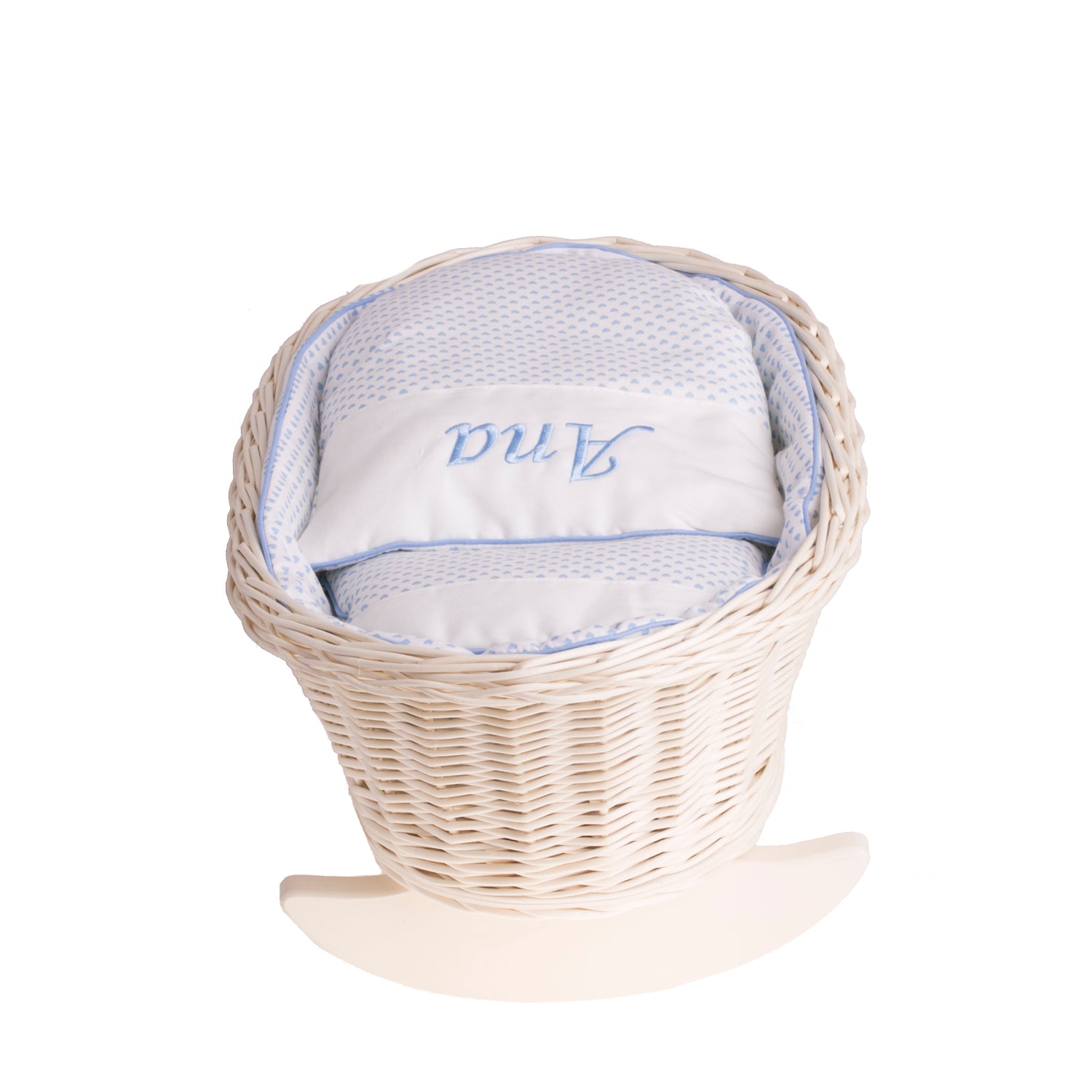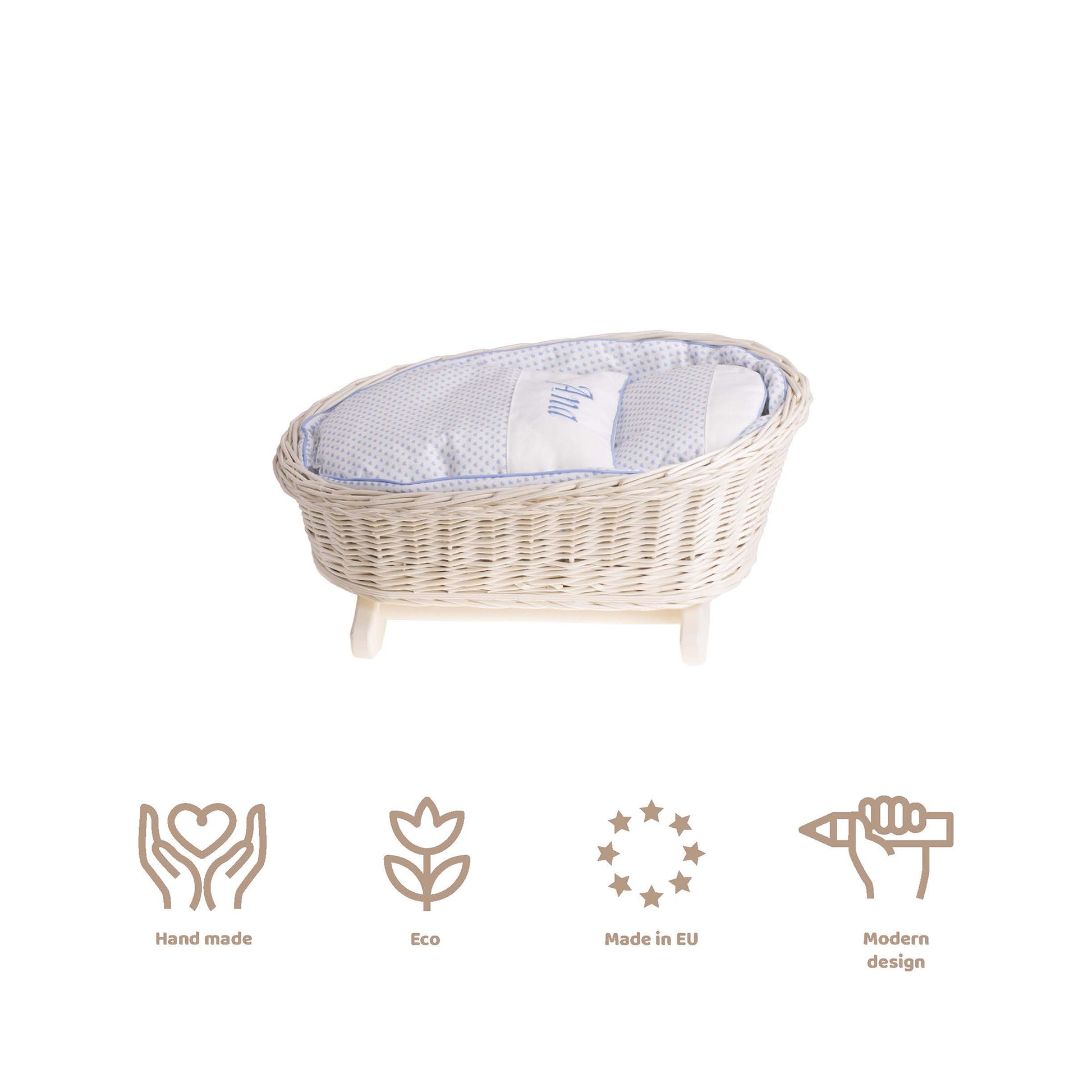 Specification of Yours Mimi wicker cradle for dolls with personalization, blue lining, pillow and duvet TheWickerStories