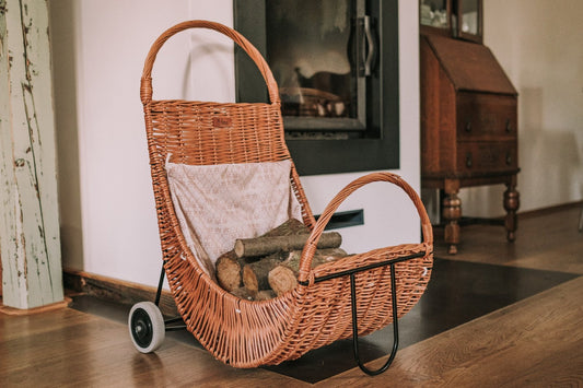 Choose a hand-woven, mobile wicker basket with a cream lining and make storing and transporting firewood at the fireplace easier.