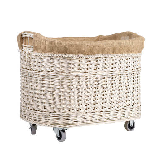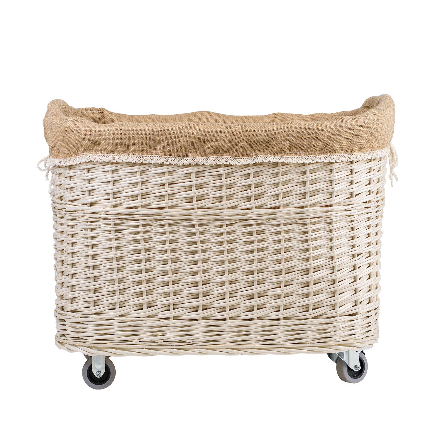 The large rectangular white wicker basket is a functional and attractive solution for storing firewood. A consistent, tight weave and classic shape give it a timeless character that fits well in living spaces. The sturdy construction and carefully finished rim highlight the basket’s high-quality craftsmanship and durability for everyday use by the fireplace.