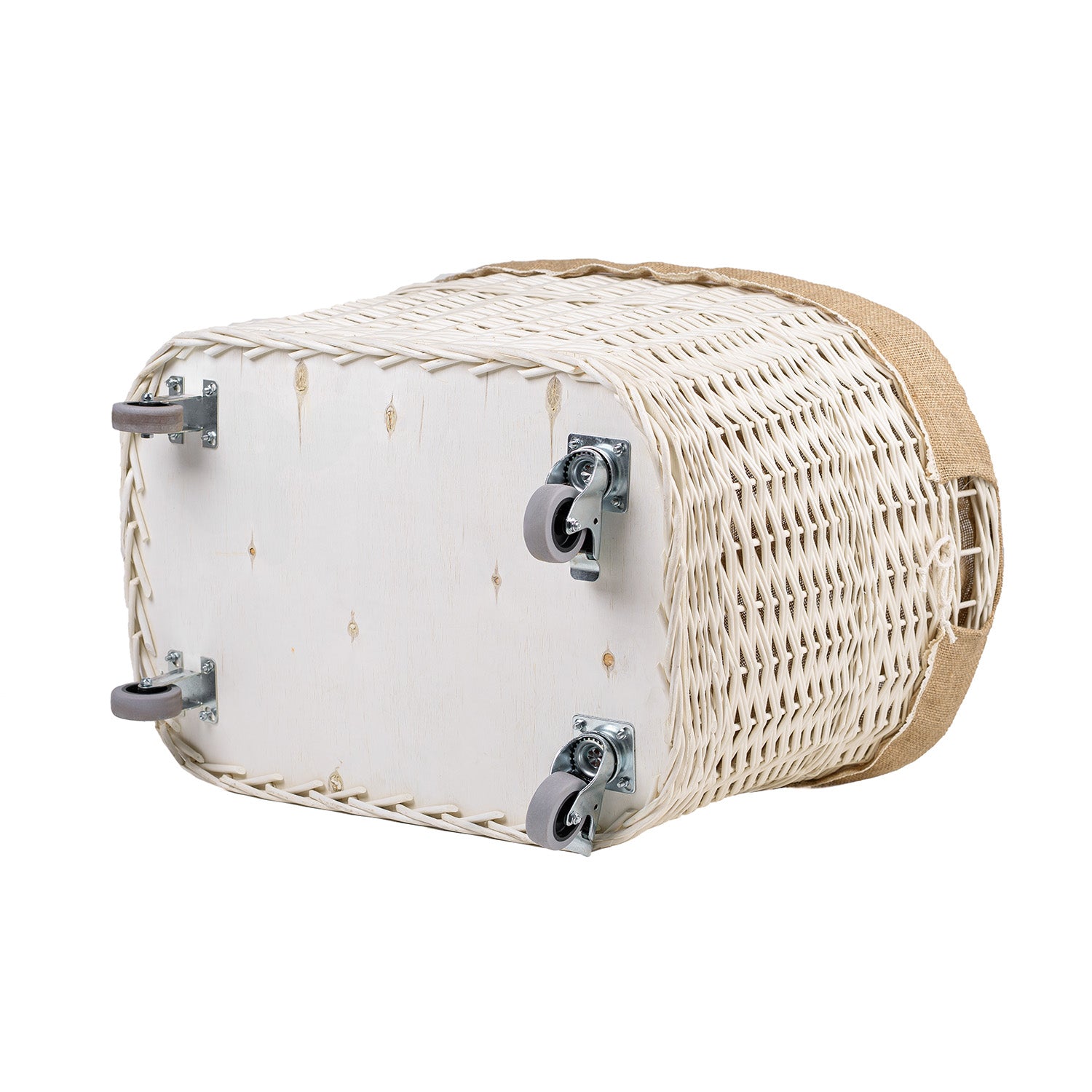 The basket is handwoven in Europe from bleached wicker and set on a stable plywood base, providing sufficient load-bearing capacity and shape retention even under heavier loads. Wicker, as a renewable and biodegradable material, ensures longevity, and the artisan weaving technique results in refined details and a long product life.