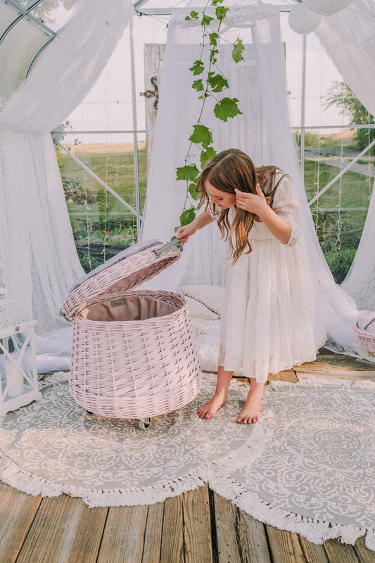 Made from durable, flexible wicker, the trunk is lightweight yet resistant to daily use. The basket is produced in the European Union from natural wicker following Polish traditional weaving techniques inscribed on the UNESCO Representative List of the Intangible Cultural Heritage of Humanity. The trunk is painted in a fashionable pink tone using user‑safe certified paints. The natural material is biodegradable and home‑safe, and hand weaving guarantees the unique character of each piece.