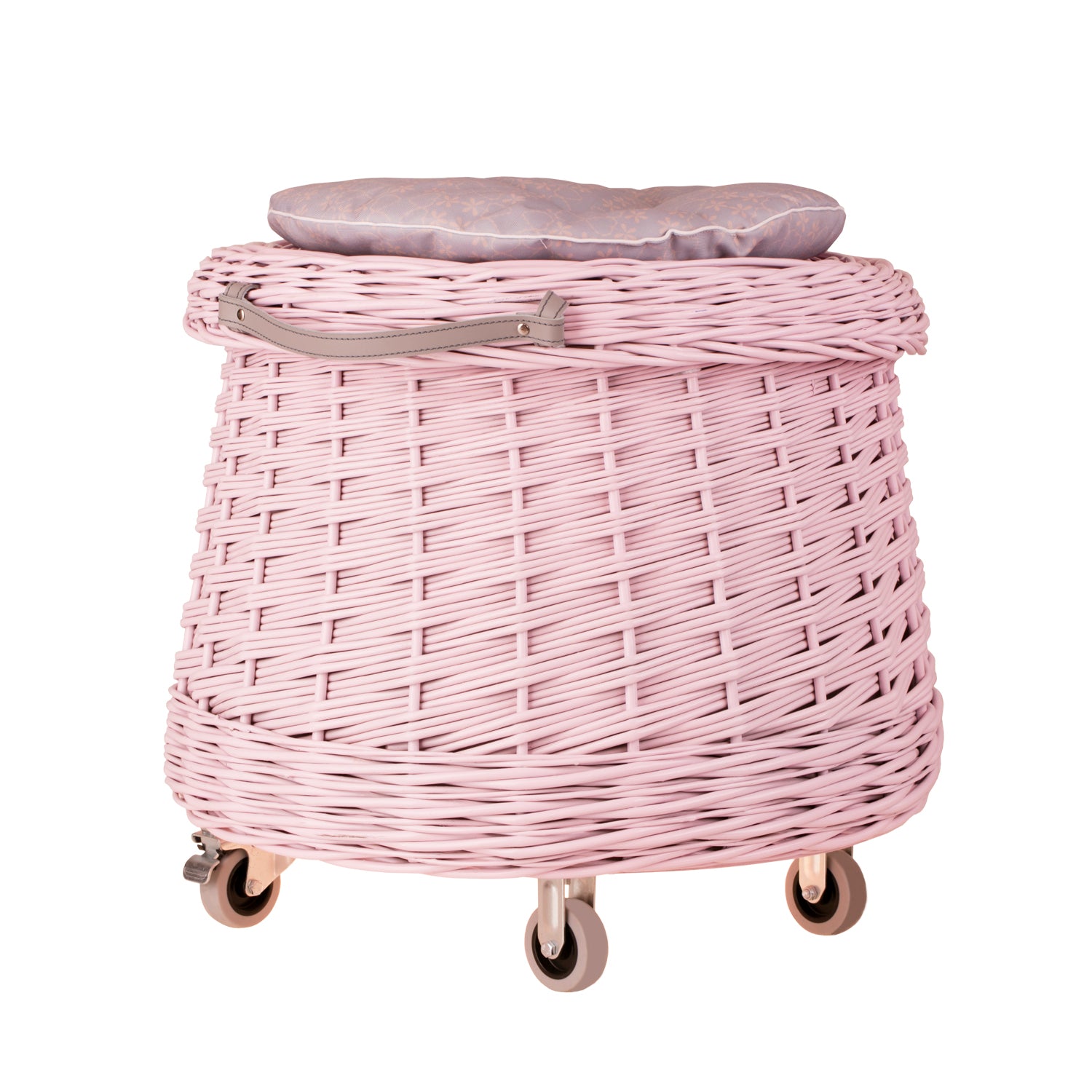 Round wicker trunk in a powder pink shade, hand‑woven with a tight, even weave. The interior is lined with a pink trim in soft fabric that adds cosiness. The whole unit moves on four discreet wheels, two of which feature a practical brake for stability and safety. On top of the basket there is a soft cushion that serves as a comfortable seat. Product dimensions: Ø57 H:50 (cm).