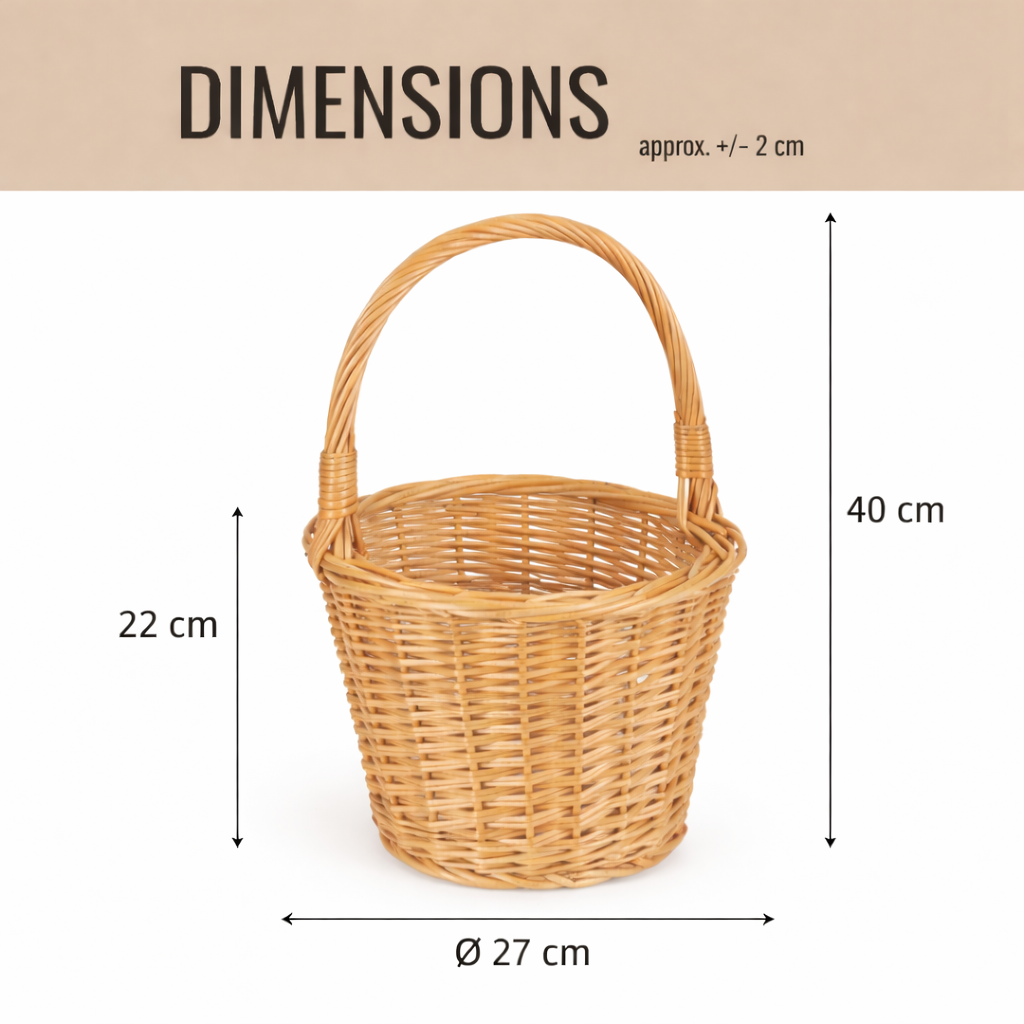 During the holidays it will be a practical basket for the Easter blessing: the comfortable handle makes it easy to carry, and the round shape fits eggs, bread, and small decorations. The natural color pairs beautifully with a white napkin and greenery, creating a calm, festive arrangement. The basket stands stably on a countertop.
