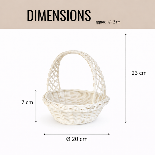An elegant Easter basket in white features a round shape and a clearly defined, gently curved handle. A dense, even weave creates an attractive surface, while the reinforced rim and stable, flat base help maintain its shape. The gently rounded rim profile makes it easy to place and remove contents.