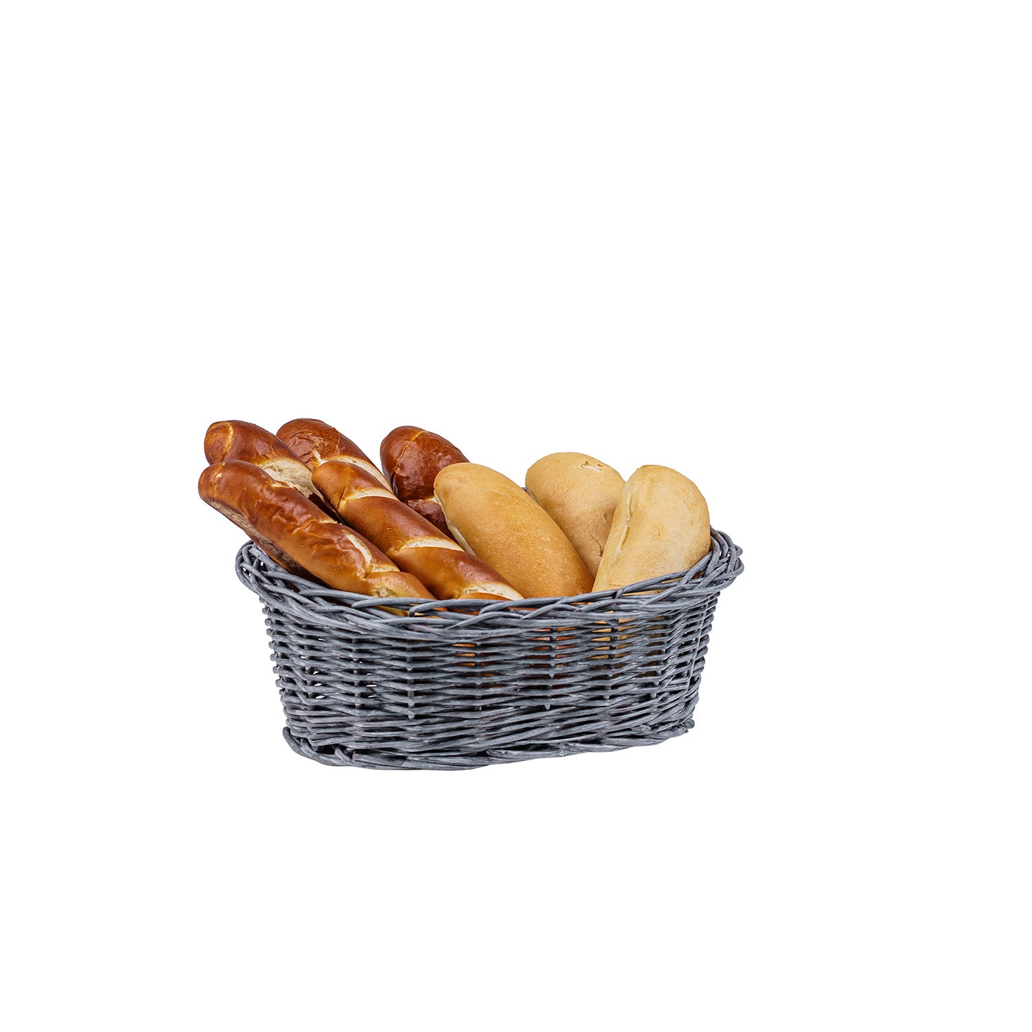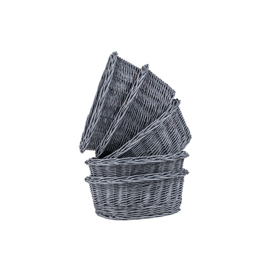 Set of five oval wicker baskets in a grey color provides a coherent, elegant base for displaying bread, pastries or other goods in bakeries. Each basket features a dense, even weave and a smoothly finished rim, which adds to the aesthetics and convenience of daily use. The grey tone highlights the natural look of baked goods and suits both modern and classic interiors.