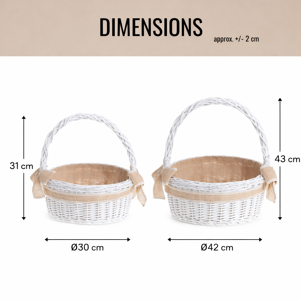 O cesto é ideal para cerimónias importantes: casamentos, batizados e primeiras comunhões. Serve para espalhar pétalas de flores, oferecer doces e bolachas, expor pequenas lembranças e criar composições de mesa apelativas. Na Páscoa é perfeito como cesto de Páscoa, acomodando ovos, pão, um cordeirinho e outros símbolos tradicionais da festa. A sua paleta de cores clara e o acabamento natural enquadram-se lindamente na decoração de primavera e pascal da mesa e da casa. A pega confortável facilita o transporte e a juta protege e organiza o conteúdo. O forro não é removível nem adequado para lavagem na máquina, mas é fácil de cuidar — basta aspirar regularmente ou escovar a seco.