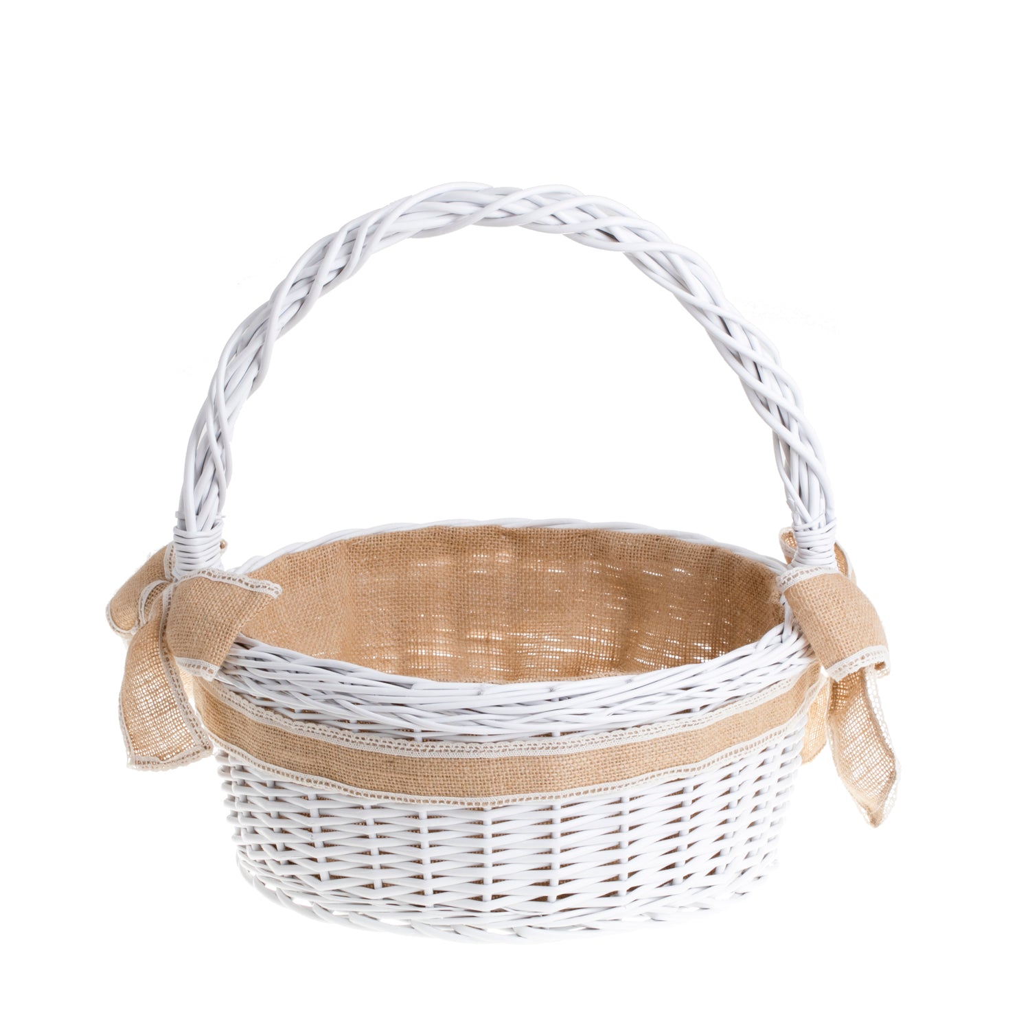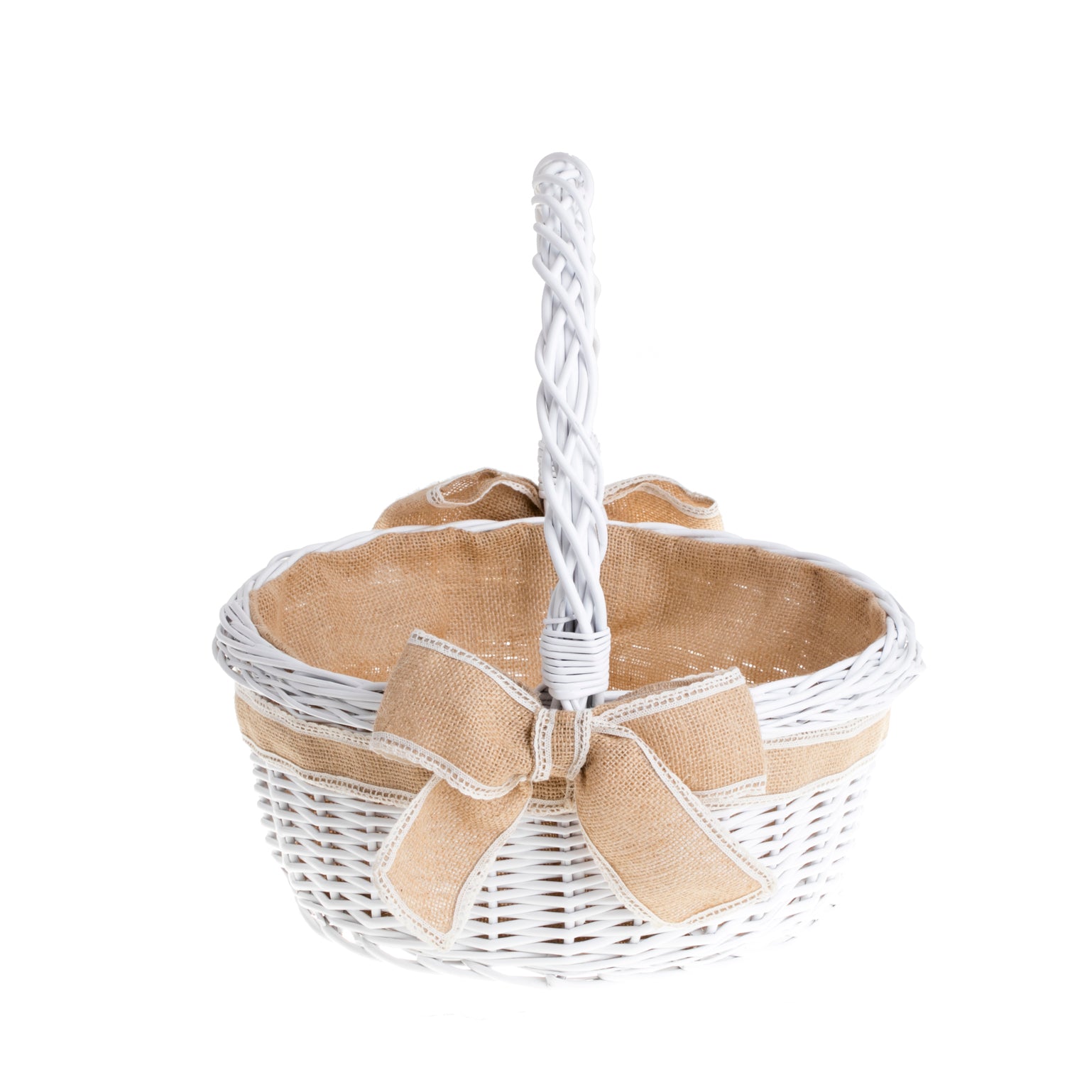 Um elegante cesto em vime encanta com a sua trama branqueada e uma pega decorativa com trança torcida reforçada. O interior está forrado com juta natural, criando um acabamento macio com laços decorativos na aba. Ao longo da borda corre uma fita subtil de juta com renda, que realça o traço artesanal. Uma margem cuidadosamente acabada e uma trama uniforme e densa conferem leveza e classe ao conjunto, perfeito para arranjos festivos.