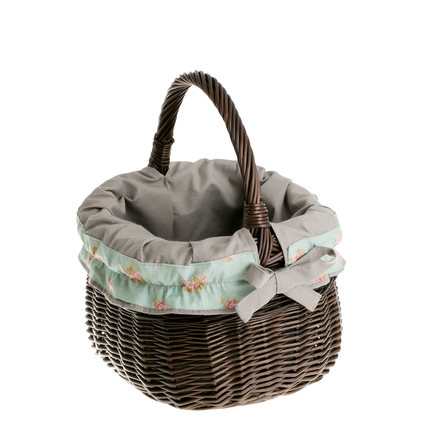 Coșul clasic din nuiele pentru cumpărături impresionează prin forma sa rotundă, plină și prin nuanța profundă de maro închis. Împletitura densă și uniformă îi conferă eleganță și rezistență în utilizarea zilnică. Mânerele răsucite, bine conturate, facilitează purtarea, iar marginea moale din stofă gri cu șnururi finisează discret bordura și protejează conținutul. Pereții rotunjiți trec lin în baza stabilă care stă ferm pe orice suprafață.